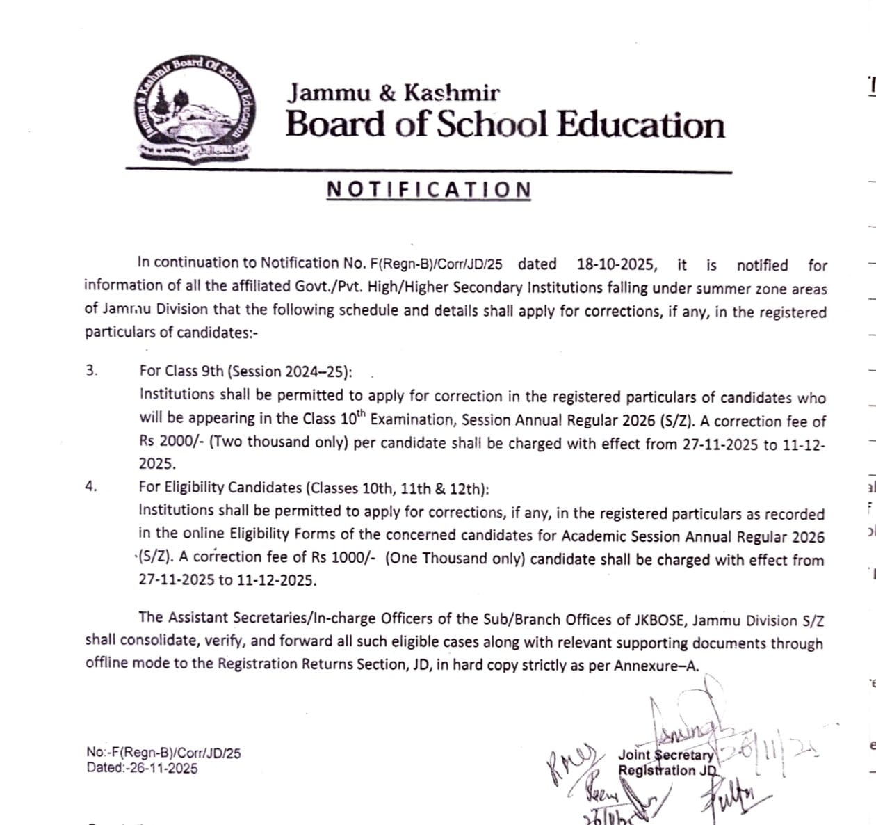 The Jammu & Kashmir Board of School Education (JKBOSE) has released an important notification regarding corrections in registered particulars of students of various classes for the Annual Regular 2026 Session (Summer Zone). Issued under Notification No. F(Regn-B)/Corr/JD/25, dated 26 November 2025, the circular provides a detailed schedule, correction fees, eligibility conditions, and instructions for institutions involved in the correction process.