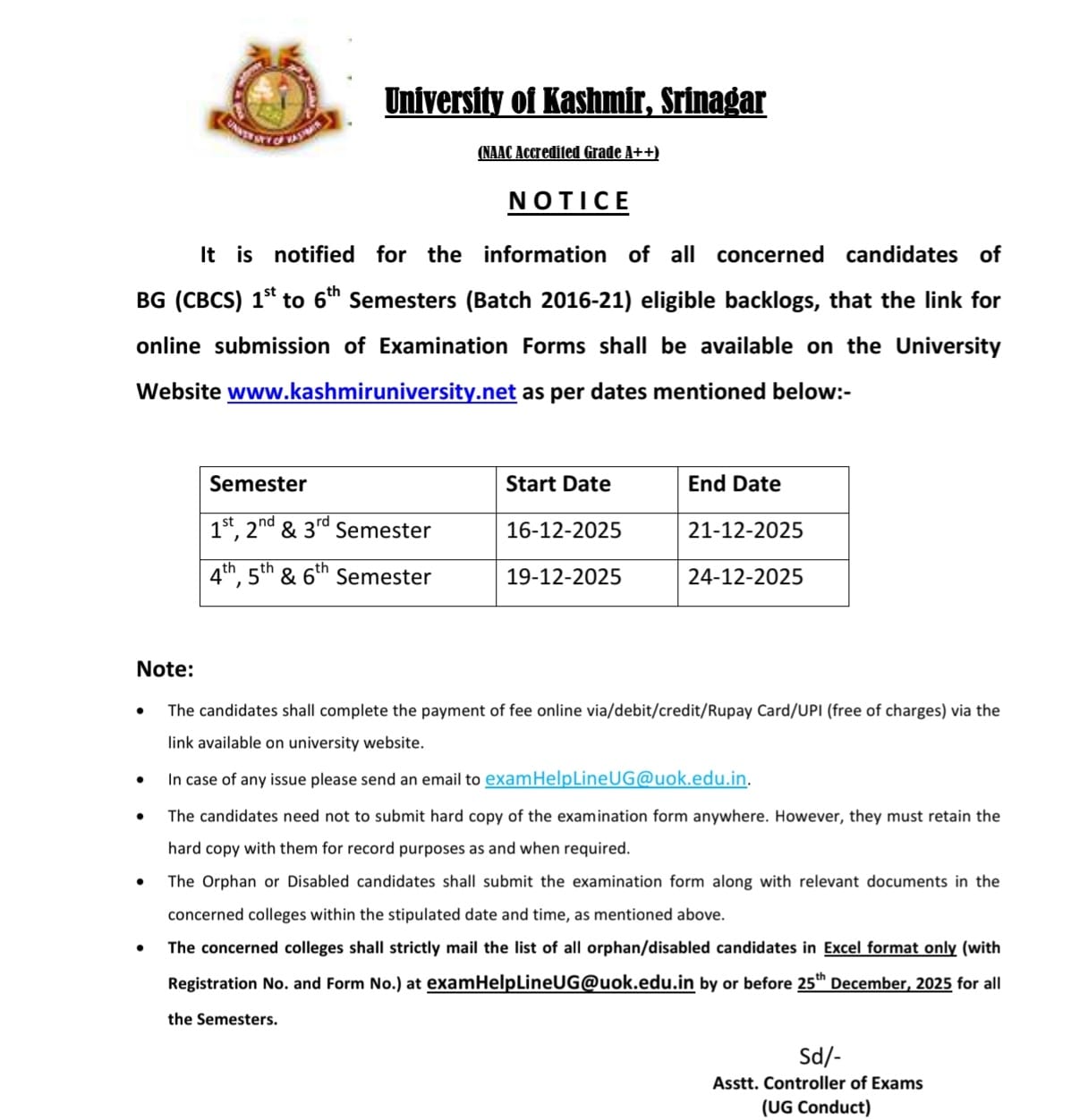 The University of Kashmir, Srinagar has issued an important notice regarding the online submission of examination forms for BG (CBCS) Backlog candidates of 1st to 6th Semesters belonging to Batch 2016–2021. As per the notification, the examination form link will be activated on the University’s official website www.kashmiruniversity.net within the prescribed dates mentioned for each semester group.