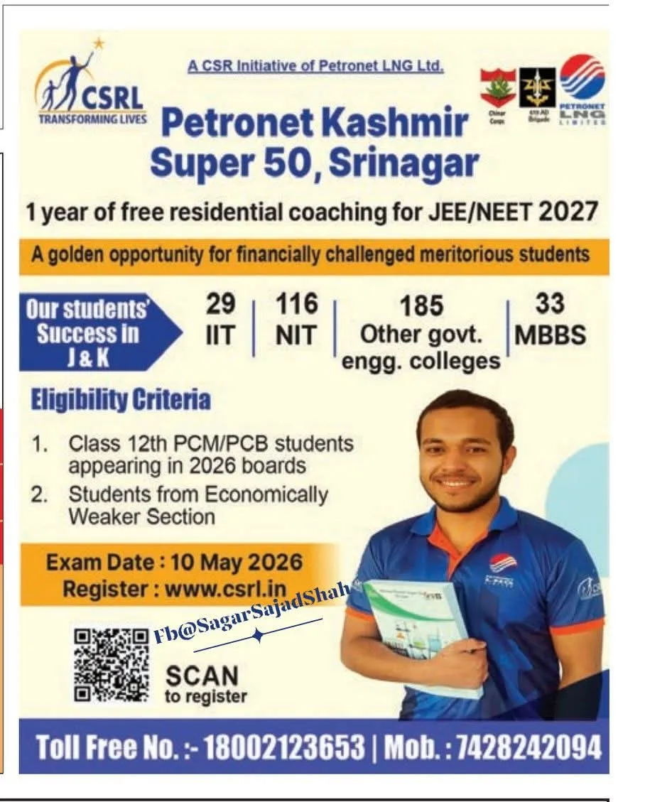 Petronet Kashmir Super 50 Srinagar 2026: The Petronet LNG Limited under its CSR initiative has announced the Petronet Kashmir Super 50 Srinagar 2026 program to provide one year of free residential coaching for JEE and NEET 2027 aspirants. This initiative is specially designed for meritorious students from economically weaker sections of Jammu and Kashmir. The program offers quality coaching, accommodation, and academic support to help students secure admission in top institutions like IITs, NITs, and government medical colleges. The entrance exam for selection is scheduled for 10 May 2026, and eligible students can register online through the official website www.csrl.in. The scheme has already helped many students achieve success in competitive exams, making it a valuable opportunity for deserving candidates aiming for higher education in engineering and medical fields.