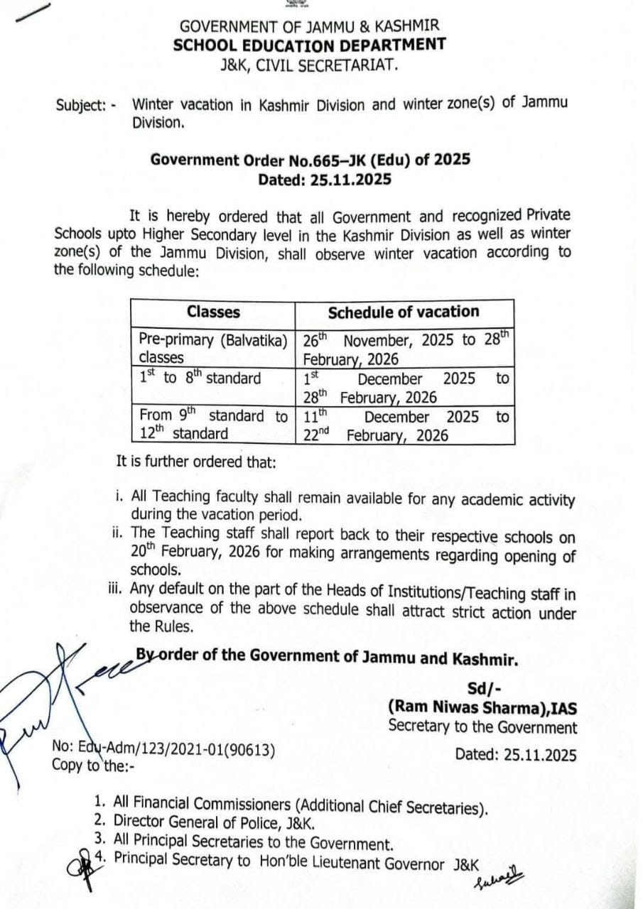 The Jammu and Kashmir School Education Department has officially announced the winter vacation schedule for all Government and recognized Private Schools up to Higher Secondary level across the Kashmir Division and the winter zone(s) of the Jammu Division. The announcement has been made through Government Order No. 665–JK (Edu) of 2025, issued on 25 November 2025.